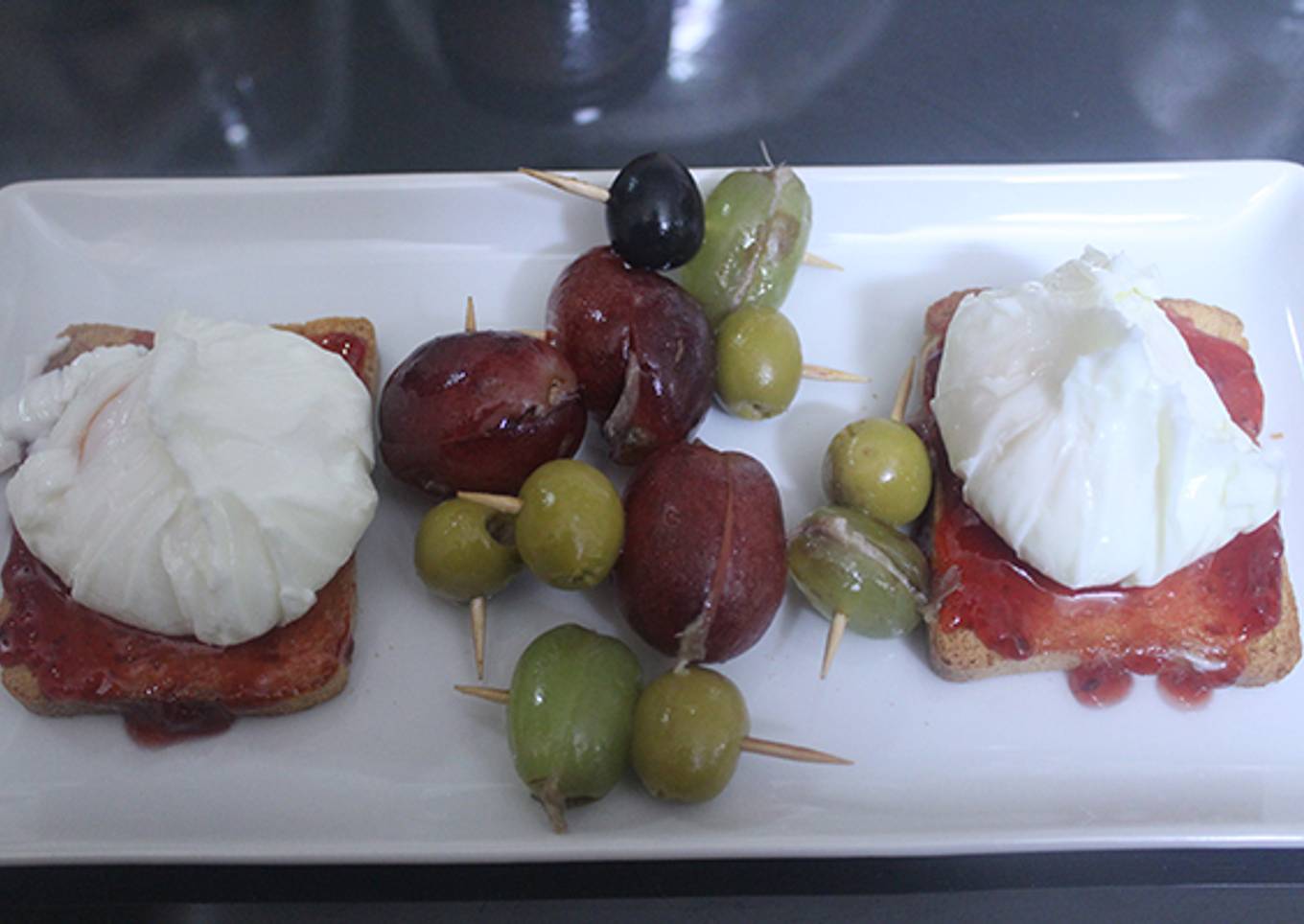 Huevos poche sobre tostadas con uvas rellenas de anchoa