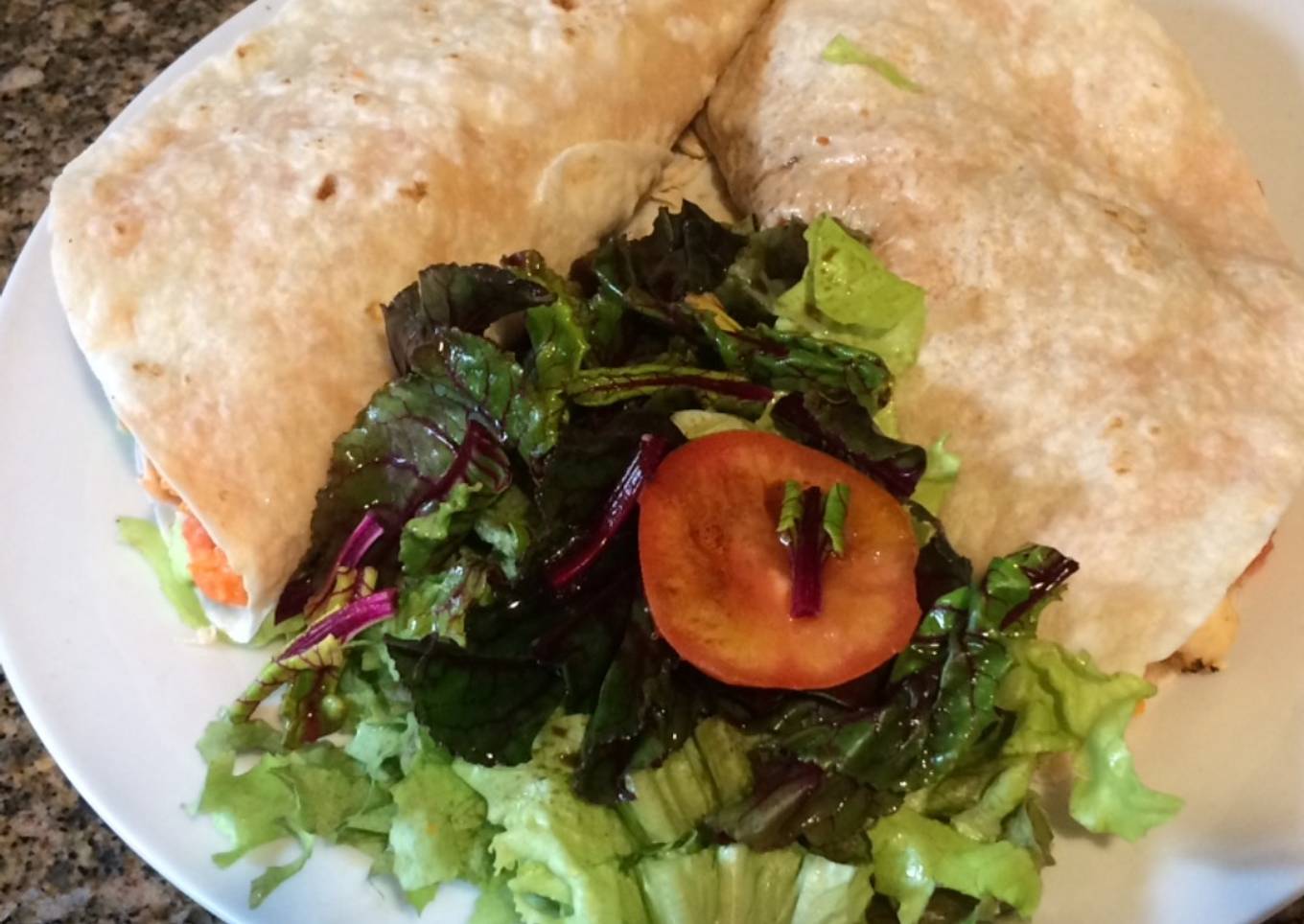 - Cortar la pechugas en tiras y doblar las tortillas por la mitad. Poner 2 en cada plato y acompañar con ensalada de verdes condimentada con emulsión de aceite de oliva, aceto y sal marina.