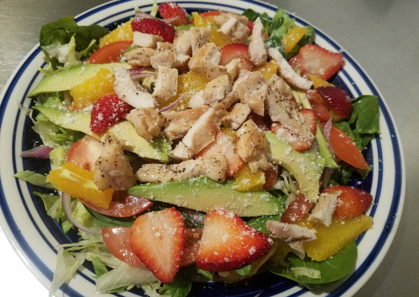- Asamos la pechuga con sal pimienta y ajo, la partimos en pedacitos. En un plato agregamos el puño de lechuga, encima las espinacas, después agregas el tomate cortado en rebanadas, la naranja, el aguacate, la cebolla, las fresas y por último el pollo. Decoramos con el queso parmesano y listo a degustar.