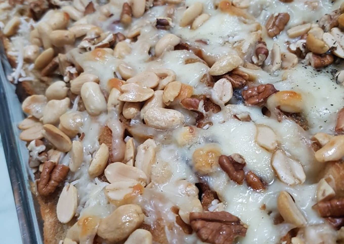 - Poner otra capa de pan tostado, de coco, cacahuate, nuez, queso y bañar nuevamente toda nuestra segunda capa hasta acabar con el piloncillo.
