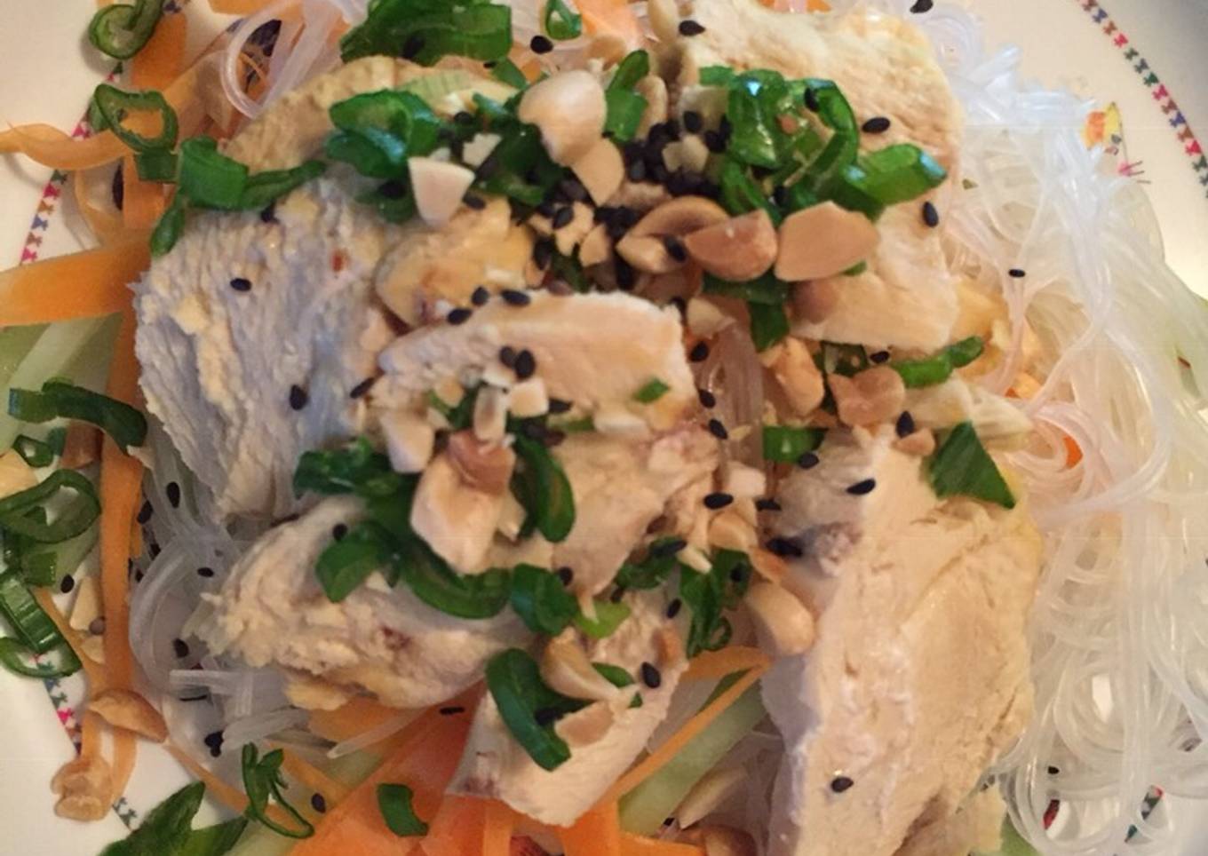 - Para servir, pones primero los fideos después los vegetales y por último el pollo, espolvoreando ajonjolí, cacahuate y cebollín para decorar y aderezo de cacahuate al gusto.